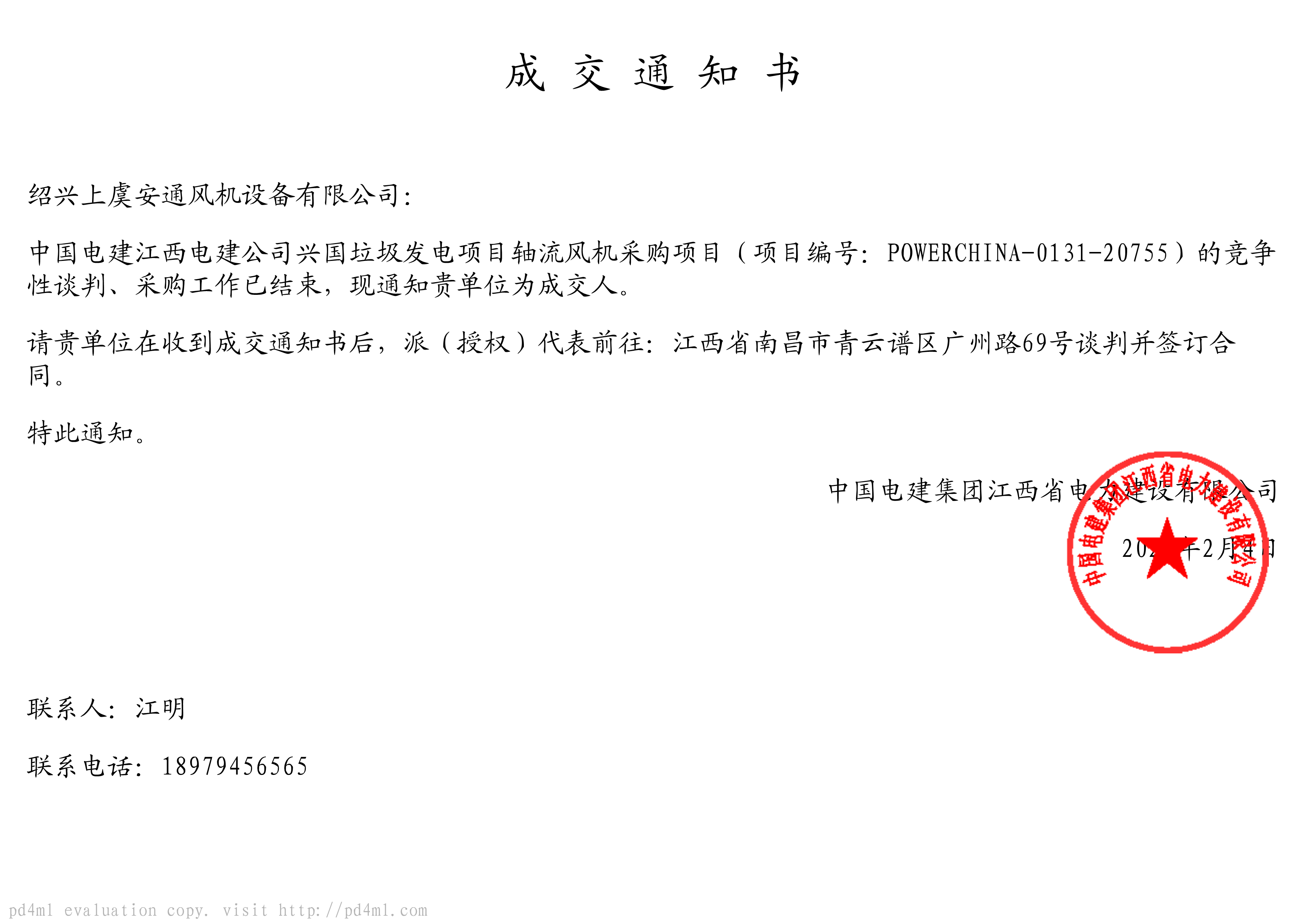 2月4日公司收到中國電建江(jiāng)西省電力建設有(yǒu)限公司成交通知書,公司順利中標興國生活垃圾焚燒項目軸流風機采(cǎi)購項(xiàng)目。為2021年良好開局打下堅實基礎。